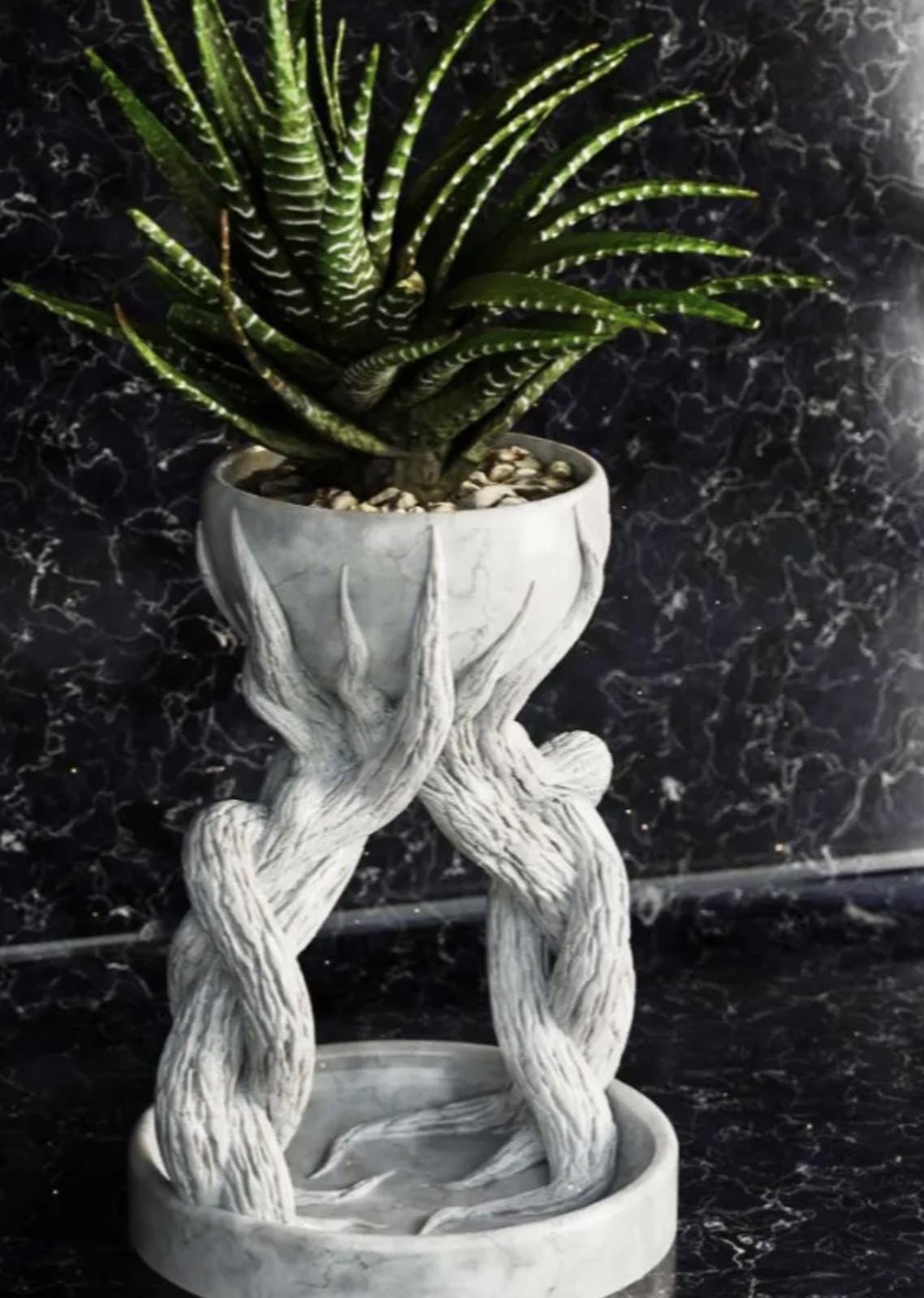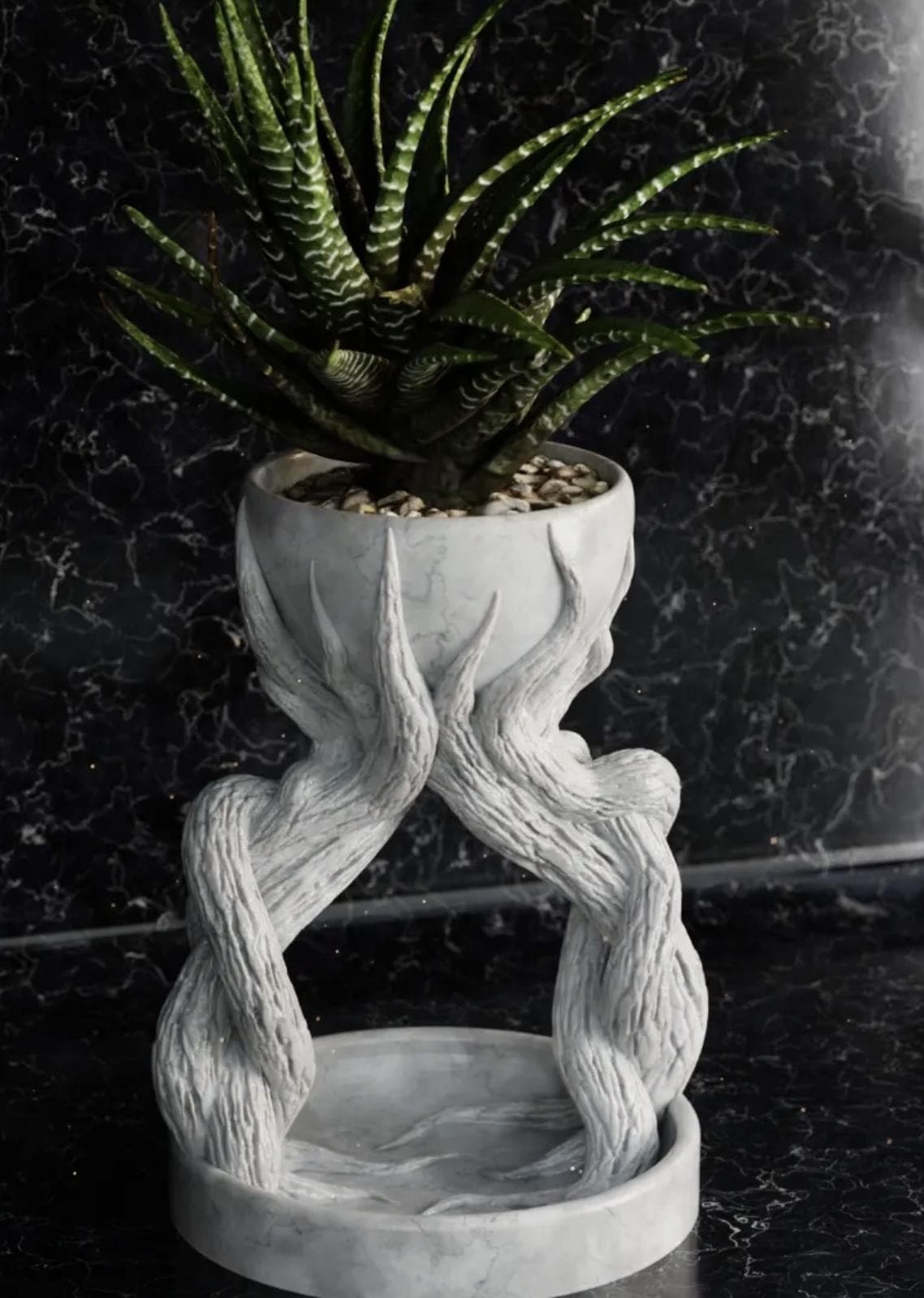 This decorative piece, created through 3D printing, embodies the organic connection between nature and modern design. The elegant, twisted forms rise to support a planter, bringing an artistic touch to any interior space. The textured details add dynamic visual appeal, giving it a refined sculptural look. Additionally, the vase can be customized to your liking, as it can easily be painted at home with regular paints to match your style.