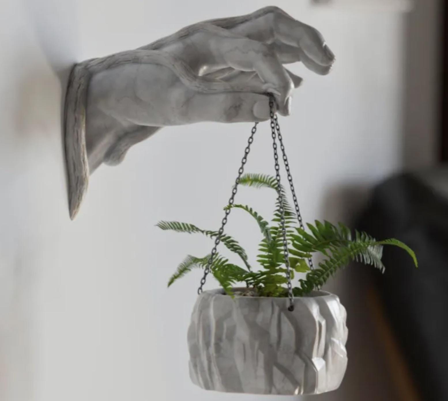 This contemporary sculpture, featuring a hand emerging from the wall, adds a touch of creativity to your interior decor. The delicately sculpted hand holds a set of chains with two fingers, from which a flower pot is suspended, infusing the space with elegance and sophistication. The ingenious design allows for the chain to be replaced with twine or other materials, offering the opportunity to personalize the piece’s appearance. This artwork symbolizes the connection between humans and nature, inviting viewers to reflect on everyday interactions. Unique and versatile, this piece enhances the aesthetic of any space, becoming a focal point that sparks admiration and profound conversations.